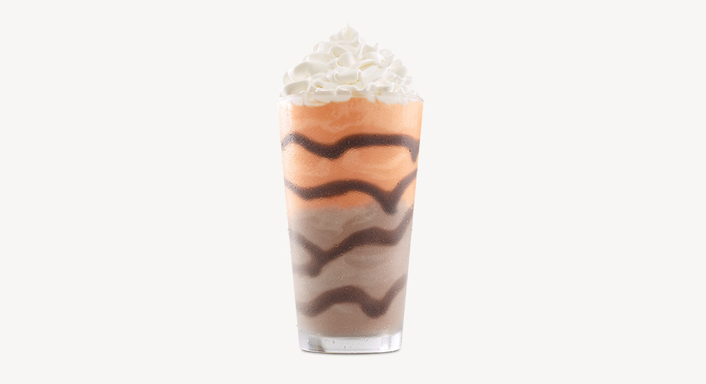 The shake is a combination of the Orange Cream Shake and Ultimate Chocolate Shake with swirls of Ghirardelli chocolate sauce forming stripes.