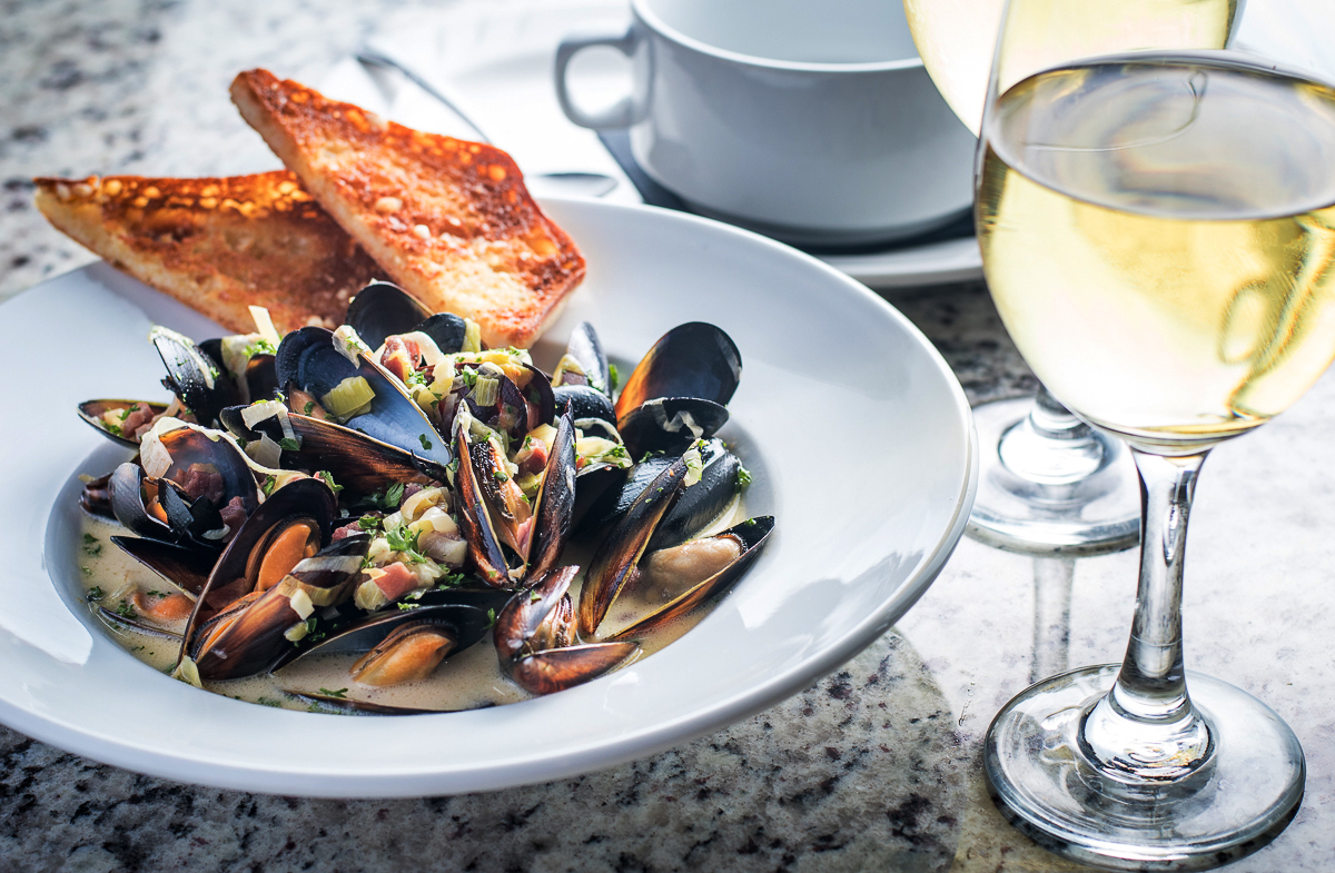 The cafe’s mussels are served with caramelized leeks, pancetta, wine, garlic, a touch of cream, and ciabatta.