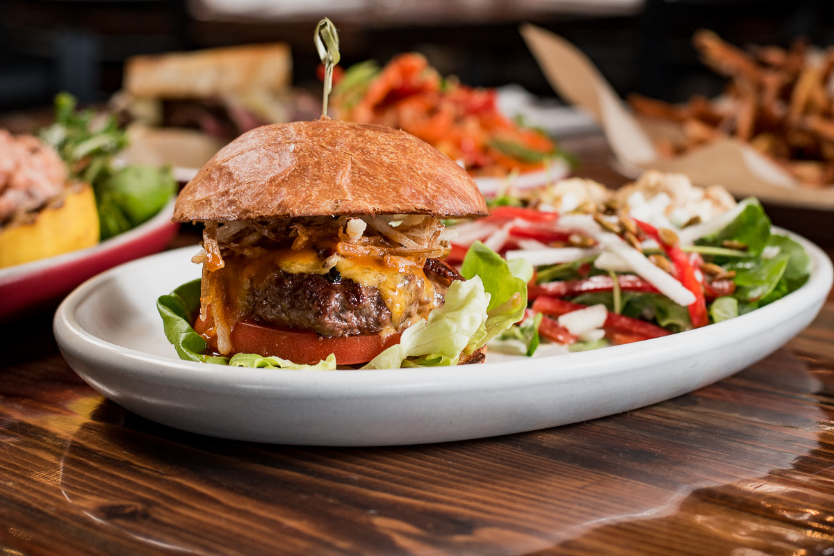 Smokey the Burger – aged cheddar cheese, house bacon, fried leeks, and house smoked barbecue sauce, on house brioche bun