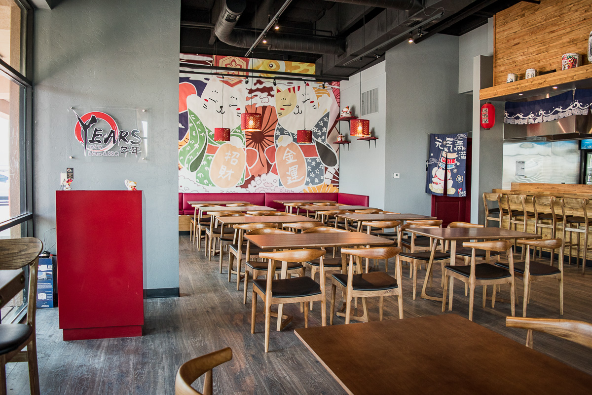The 2,100 square-foot restaurant seats about 80 with a patio to open in October. Lanterns and cats are the main motifs decorating the hip yet rustic space, which previously housed Regency Beauty Institute. As it turns out, the space was chosen for its location.