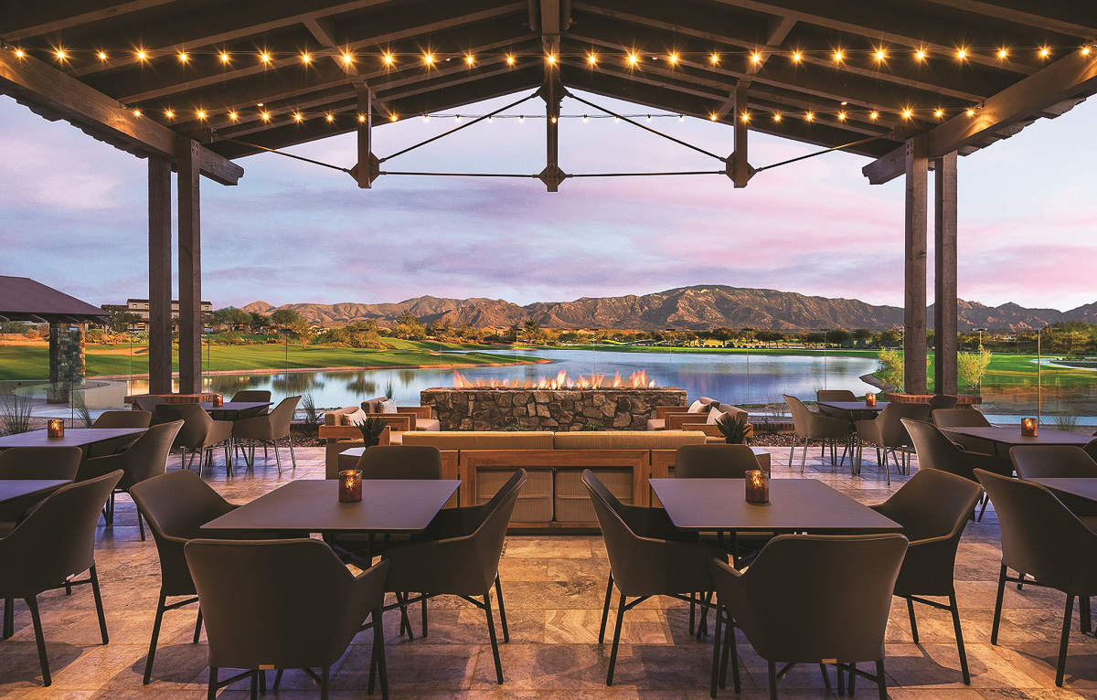 The restaurant seats 126 indoors and 40 outside with its scenic views of the Santa Catalina Mountains and SaddleBrooke golf course. The interior features a U-shaped bar, wood beams, and a stone fireplace for a warm vibe.