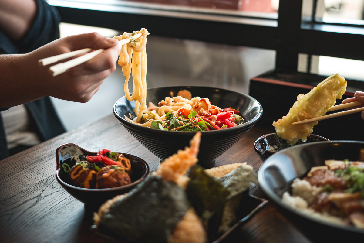 Additionally, the restaurant features a ‘topping bar’ with ingredients such as seaweed strips, raw garlic paste, pickled ginger strips, sliced scallions, sesame seeds, cilantro, tempura bits, ponzu sauce, spicy mayo, and more.
