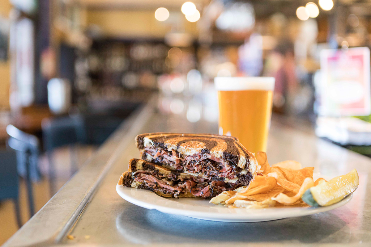 A clean, woodsy aroma from the juniper and black pepper-smoked pastrami sets the Maynard’s Pastrami Reuben apart.