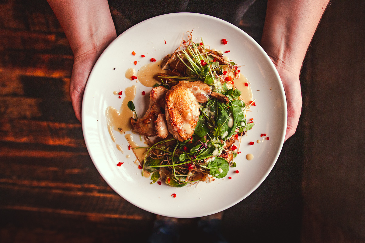 - Duck – Coffee-rubbed smoked duck breast, sweet potato, baby purple carrots, escabeche, and mole blanco