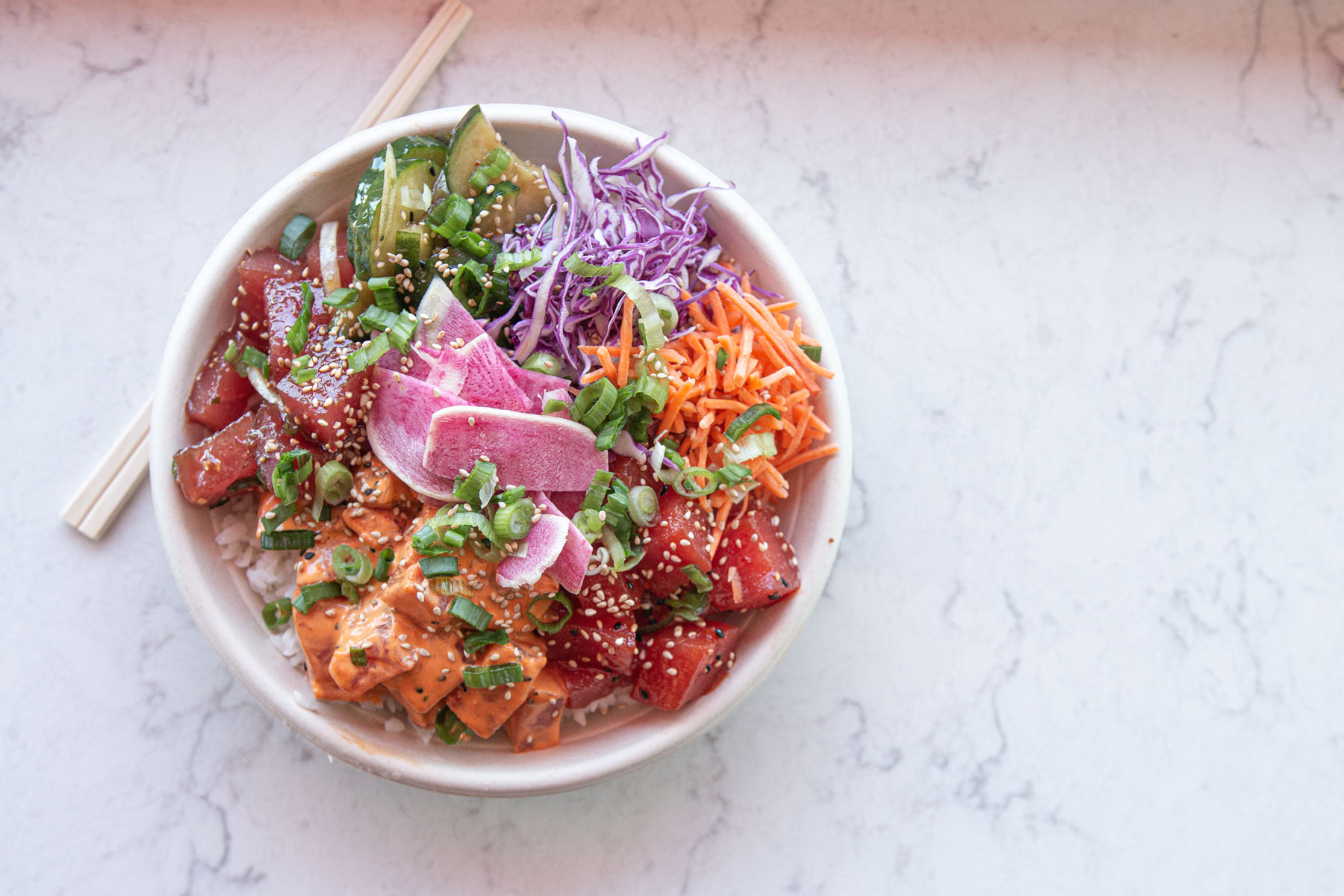 Over in the bowl department, it’s most of the toppings you’ve come to expect in a poke bowl with a few additions. And, of course everything is super fresh. Just like the fish, the veggies are cut fresh multiple times a day. Choose (or mix) from four different bases of white rice, brown rice, sesame noodles, and baby salad greens.