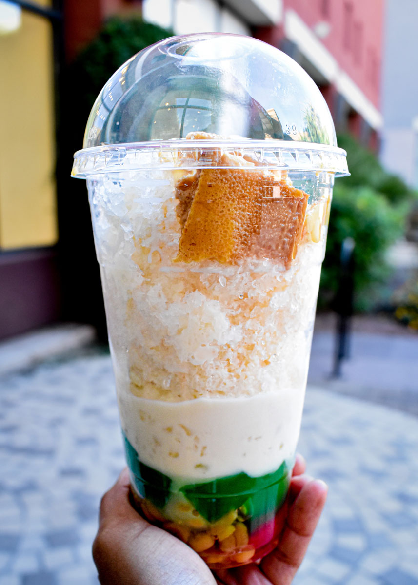 Don’t forget to end with something sweet and ask for Halo-Halo, a dessert with a name that literally translates to “to mix”. Inside is a colorful array of ingredients from around the world that simultaneously work together to create a balanced synchronization of flavors. Some may even go as far as to say that it is an embodiment of the Filipino way of life. Fiesta Filipina’s version features flan sitting on top of crushed ice and sweetened milk, with a combination of Chinese beans and coconut jellies underneath.
