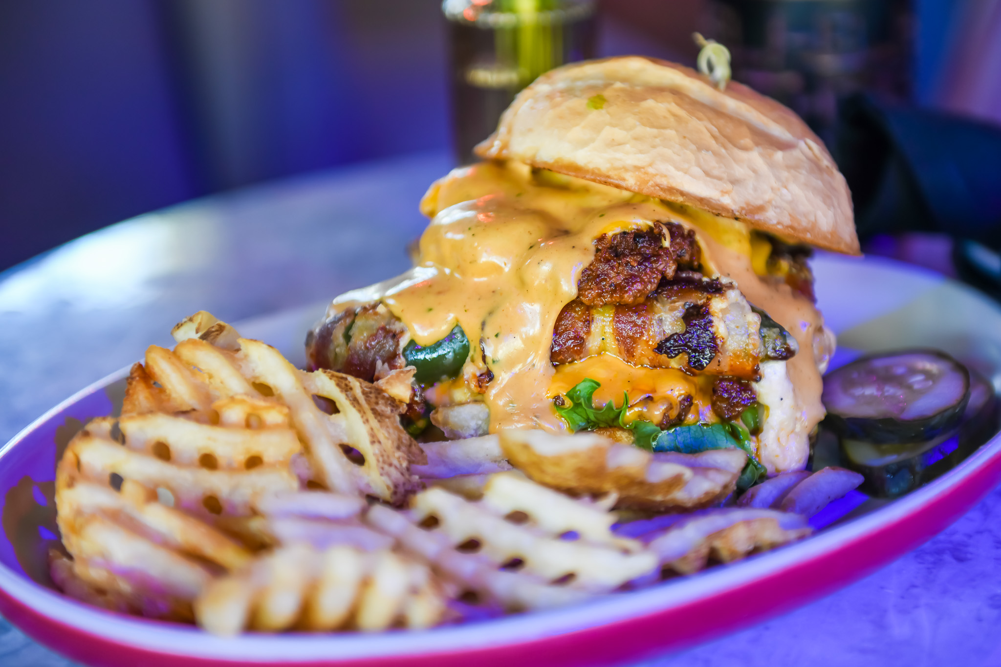 Waffle fries, poblano cheese sauce, pico, pickled onion, seared black beans, fresco, manchego, guacamole, chipotle crema (add chicken or birria for a total of $17)