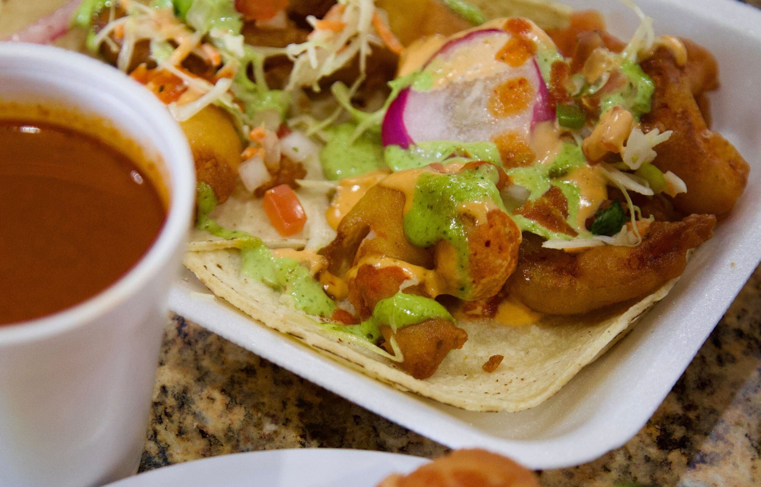 Each piece of shrimp and fish at Taco Fish is fried to a perfect dark brown, resulting in a crunchy and buttery texture that isn’t greasy. The tacos are generously portioned, with enough ingredients for two, which is why the restaurant includes a second tortilla under each one.