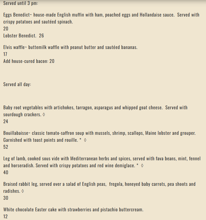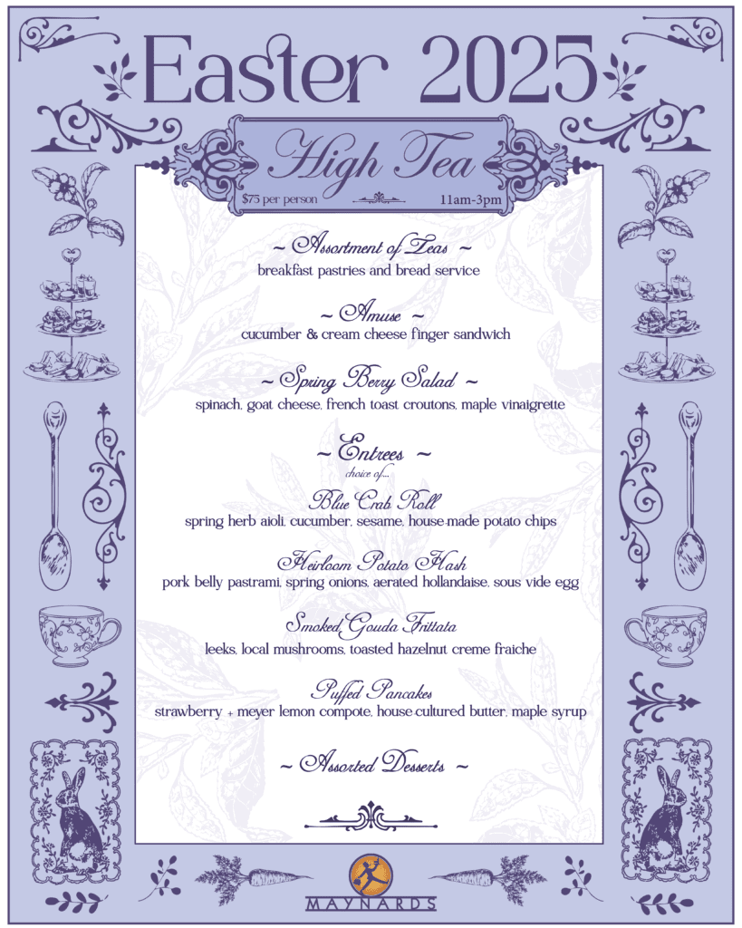Maynards is offering the above menu on Easter from 11 a.m. – 3 p.m. The meal is $75 per person.