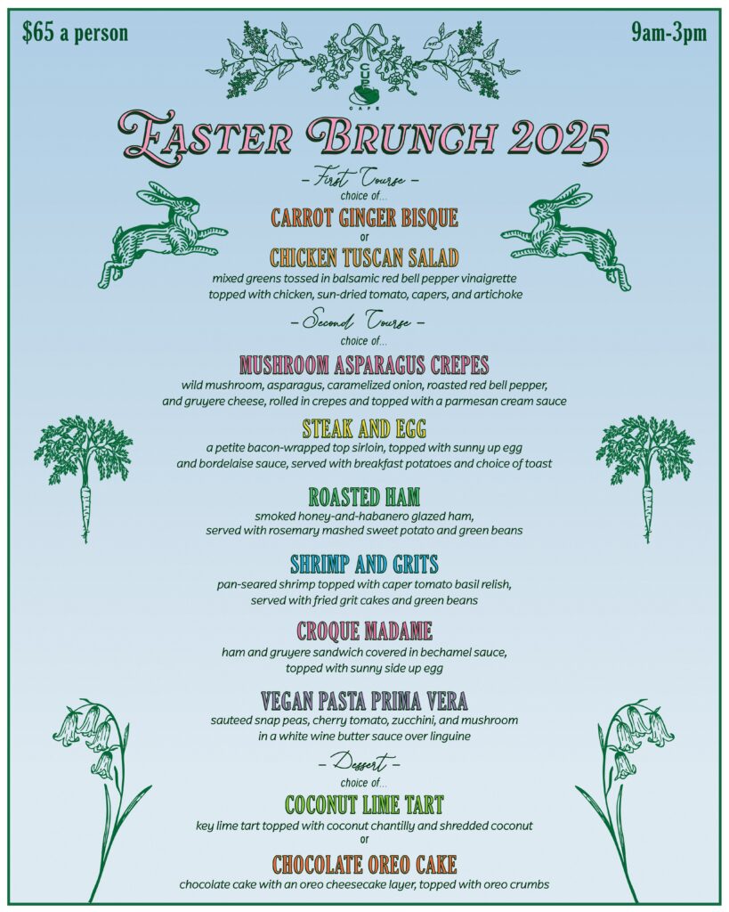 Whether you’re looking for a morning meal, an evening of elegance, or a quick bite with the family, there’s no need to hunt down the perfect event by yourself. We’re here to fill your Easter basket full of options. With that being said, one of the following restaurants should do just the trick for Sunday, April 20.