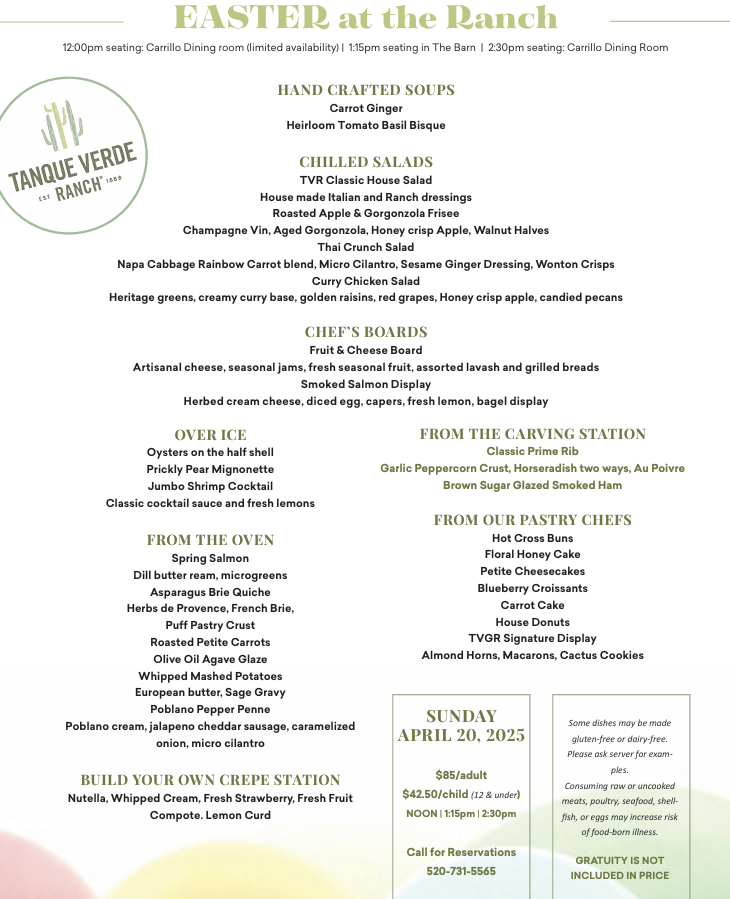 They’ll be open on Sunday, April 2, to serve some Easter specials. You can call to reserve a table at (520) 326-9363.