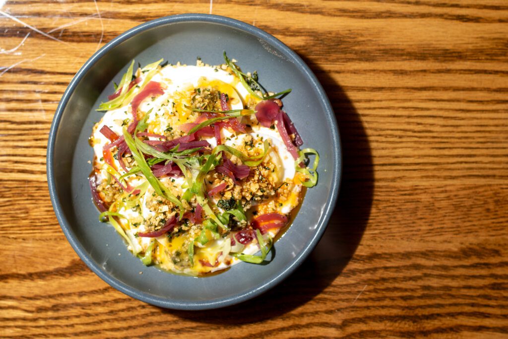 These deviled eggs pack a umami-punch with their boquerones salsa and tart hibiscus pickled shallot. Guajillo oil brings some heat.
