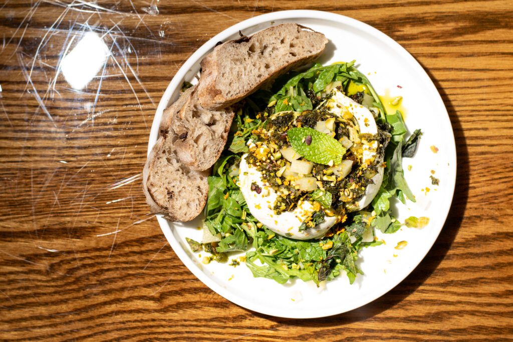 Creamy burrata lays on a bed of granny smith apple and pickled cilantro stems and mint, topped with a salsa macha verde verde and a side of house bread.