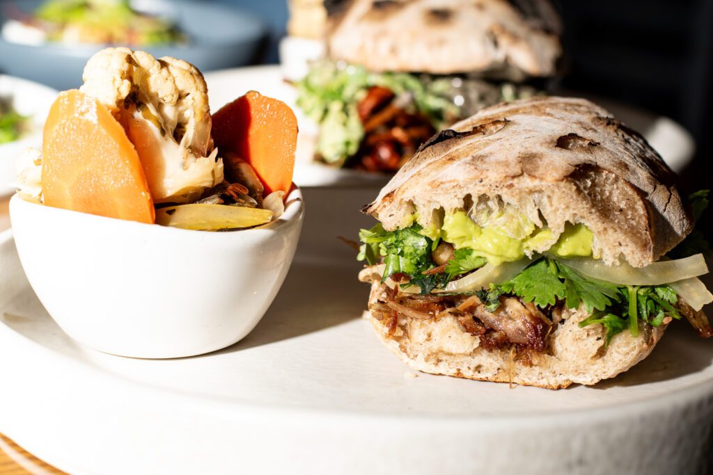 The carnitas torta picks up a little sweet and tart action with candied mandarins and pickled fennel, balanced with fresh cilantro and mashed avocado.