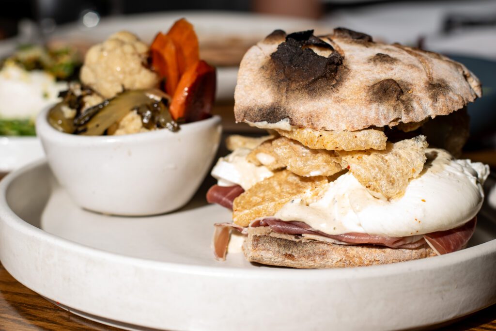 A stoner’s sandwich delight, the burrata torta balances the creamy cheese with salty prosciutto and crunchy chicharrones with rich, savory fried egg vinaigrette.
