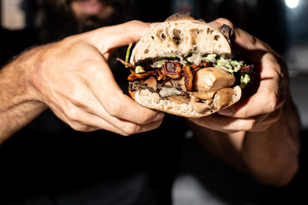 This vegetarian sandwich features mushroom conserva and crunchy porcini mushroom chips with creamy huitlacoche goat cheese and arugula. All sandwiches come on house bread and a side of nopal giardiniera.
