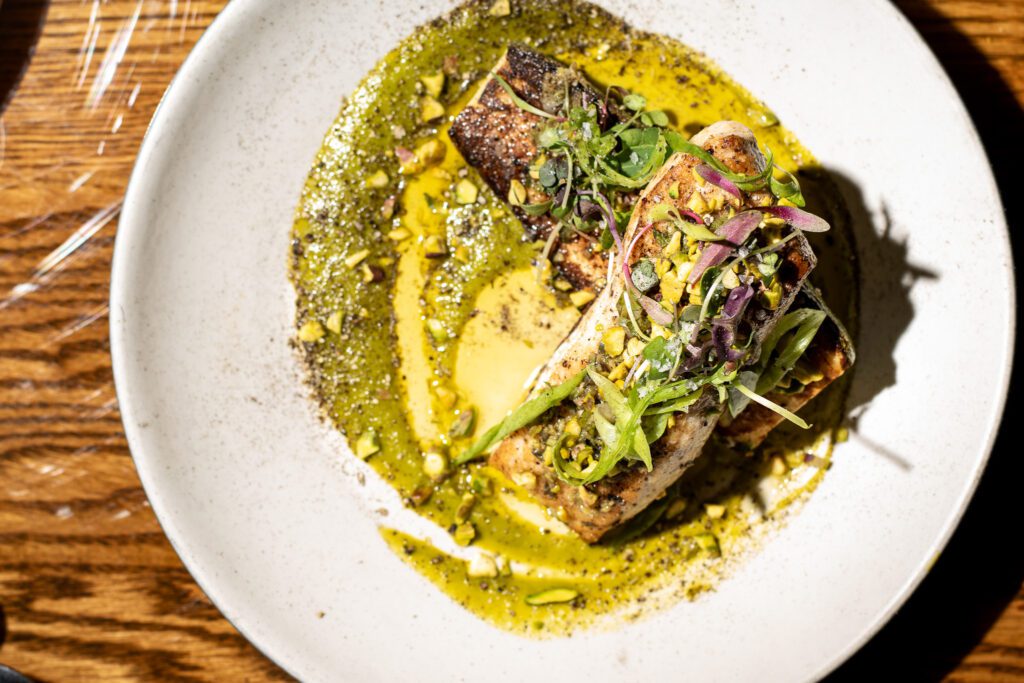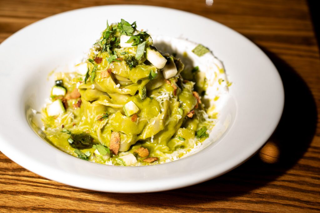 Like the deviled eggs, the carpaccio delivers intense umami with a combination of charred scallion, tonnato sauce, and fried shallot. Lime zest and fresh cilantro add brightness, while capers add a salty punch. The nopal and calabrian gremolata adds texture alongside their adorable little breadsticks. (Editor’s note: probably my favorite carpaccio in town right now)