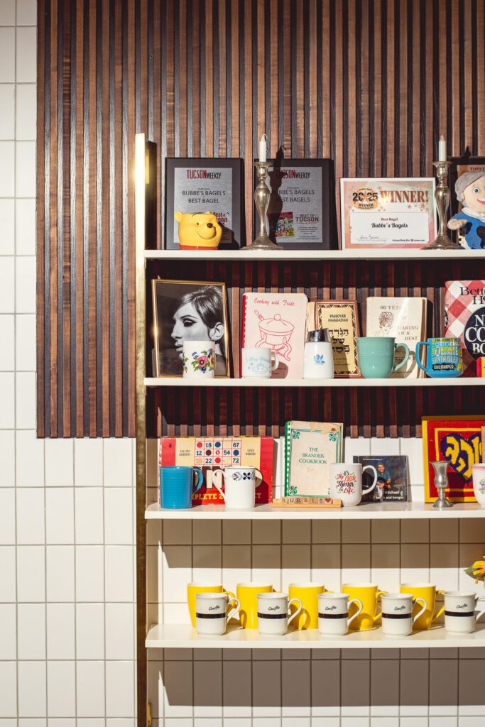 To invoke the “haimish” (warm and cozy) atmosphere of her bubbe’s home in Boston, Becca decorated the bagel shops with such iconically Jewish-coded items as a picture of Barbra Streisand, a Passover Haggadah, and a set of silver shabbos candles, along with more generic nostalgia-evoking pieces like mismatched mugs and a Better Homes & Gardens cookbook.