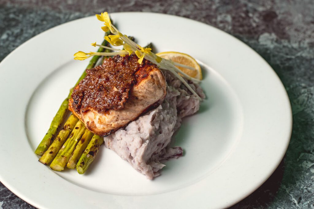 The grilled salmon fillet is glazed with fig-mustard sauce, topped with local pea shoots, and served atop garlic herb mashed potatoes and grilled asparagus.