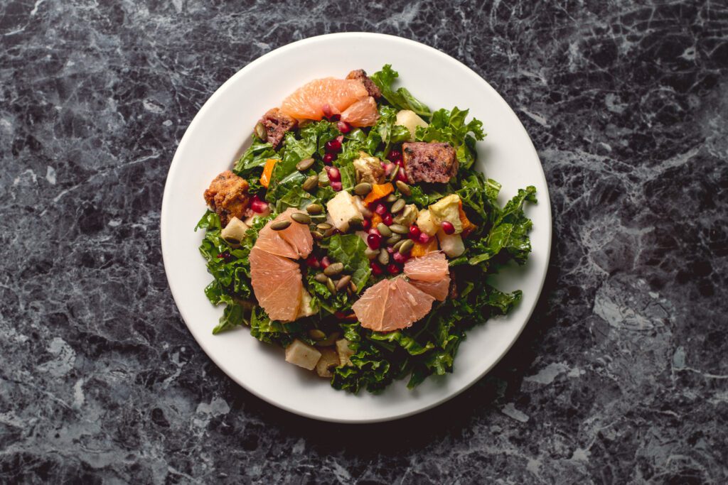 The new panzanella salad takes a southwestern take with chopped kale, butternut squash, chayote, jicama, grapefruit, green pepitas, poblano cheddar heirloom blue cornbread croutons, pomegranate, and that same smoked tomato chiltepĂn vinaigrette featured on the taco slaw.