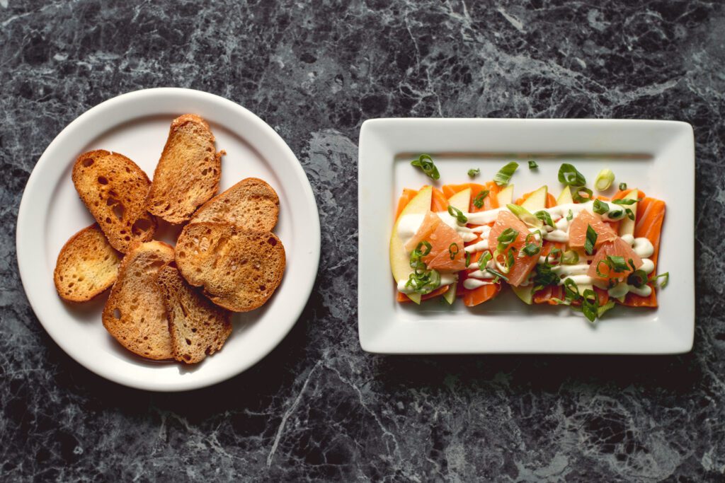 In a stride towards sustainability and reducing exposure to common contaminants like mercury, Kingfisher is giving Wildtype salmon a run. Learn more about the product and their mission here. The crudo here highlights the salmon with crisp green apple, grapefruit, scallions, crostini, and a coconut pineapple ginger lime sauce.