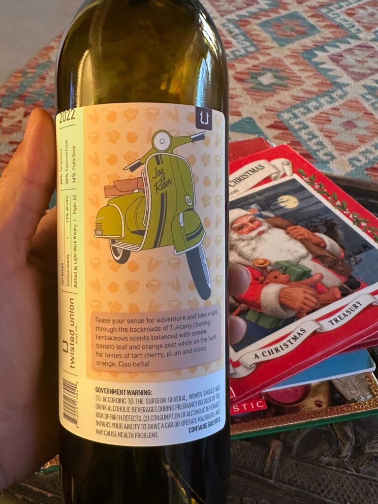 The Joy Rider from Twisted Union Wine Company is my kind of wine. On the heavier side of red, but not too heavy. Smooth and tart. Not spicy. Easy drinking.