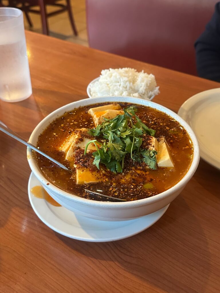 On my second visit to China Szechwan I found a dish that will bring me back again and again. The Szechwan Tofu. I wasn’t feeling sick, but as I ate this, it felt like it was healing me. And it had all the Szechuan flavors you’d expect, including those spicy and slightly-numbing peppercorns, doubanjiang, chili oil, Chinkiang vinegar, garlic, ginger, etc.
