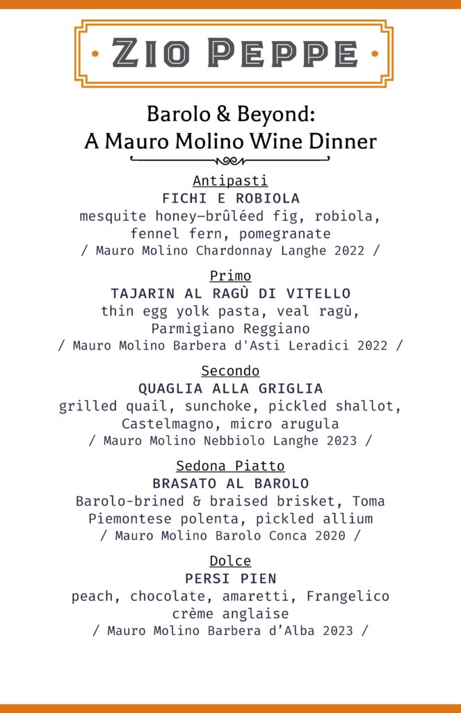 Join Chef Mat Cable for a five-course dinner at Zio Peppe, featuring exceptional pairings with wines from Mauro Molino Winery of Piedmont, Italy. Special guests Cristiano Borra, Export Manager of Mauro Molino, and Steve Lewis, Owner of Giuliana Imports, will guide guests through the wines and share the rich history of the winery.