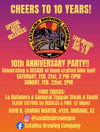 | CBC UPCOMING EVENTS – Feb/Mar Update We are turning 10 on Feb 21! February is a month full of love at CBC! And join us for our Superbowl Tailgate Party ! Follow us on Facebook or Instagram: https://www.facebook.com/CatalinaBrewingCo Check out our website: http://www.catalinabrewingco.com/beer-food-fun/ WEEKLY SPECIALS – Get Some!Live Music Mondays – Featuring rotating food trucksTaco Tuesday – Buy 3 Tacos from The Jersey Grill and get a happy hour priced beer OR now you can choose a frozen margarita!Wine Wednesday- Happy Hour glasses of house wine all night with a DJ, and monthly ‘Welcome Marana’ meetings.Thursday is all about The Jersey Grill food. Ask about beer and food specials. Friday Trivia with Rotating food optionsSonoran Dog Sunday – Enjoy a Sonoran Dog, side of chips and guac and a beer for $11. Happy Hour prices for Mimosas and Bloodys! First Saturday of the month Celebrate your Birthday with 1/2 price drafts all dayWEEKLY FUN – Be There!Monday 6-9pm = LIVE MUSIC by the Bryan Trio Band with rotating food trucks Tuesday 6pm = Marana Pinball Collective pinball league (sessions every 6 weeks)/ “Pint with the Pastor” every 1st and 3rd of the month Wednesday 6-9pm – Live DJ – you call it. Thursday 630-8pm = Our super popular DJ Bingo every week at 6:30, play for prizes! Friday 7-9p = Trivia by Team Trivia of Tucson – Prizes for first, second, and third place! https://www.facebook.com/TeamTriviaOfTucson Saturdays = Alternating Themed Parties and Live Music with occasional Tipsy Picassos paint parties in the afternoon and Pinball Tournaments. (check schedule below) Sundays = Yoga is on pause – let us know if you want us to restart it. But we still have the ever popular Mimosa, Bloody Mary’s, and Sonoran Dog specials all day! Live Music 2-5 some Sundays (see schedule)… PS: Your favorite games can be put on any/all of the TV’s and projectors. Don’t be afraid to ask for the remote 🙂 Food Truck Schedule:Every Friday (7:00-9:00): Friday 2/6 – Bomb.KomFriday 2/13 – Daniela’s CookingFriday 2/20 – Eggroll MastersFriday 2/27 – Ol’ Pot HoleMarch Fridays are TBD Some Saturdays with special events – see schedule below: All other days = The Jersey Grill Special Music / Event Schedule:Thursday DJ Bingo (6:30-8:00) Play for prizes!!!! Free to play every Thursday. Sunday 2/8 “Super Bowl Tailgate” (2:00-9:00) parking lot party with outdoor games, grill, $1 football squares, $3 domestics, and $1 Jell-O shots. Super Bowl half-time and Turning Point USA half-time shows will be televised. Pot luck food suggested. Saturday 2/14 “Pretty in Pink Galentine’s Day” (7:00-10:00) Ladies, dress up in your prettiest pink and hang with your girlfriends with Danielle at Catalina Brewing. Sunday 2/15 Live Music “Acoustic Songwriters Phil’s Birthday” (2:00-5:00) Join Phil (PJ) for an all-star line up to celebrate his birthday! Check their page for all the talent playing. Wednesday 2/18 “Glass Etching with The Crafting Mermaid” (6:00-9:00) Start off our anniversary celebration with a CBC craft! Choose between a wine or pint glass with an image of your choice. *Image must be submitted prior to class. DON’T MISS THIS! Saturday 2/21 “CBC’s 10 YEAR ANNIVERSARY!!!!” (2:00-11:00) 4:00 La Bufadora and Samurai Teppan Steak and Sushi food trucks 2:00-10:00 Needles and Pins Tattoo flash tattoos 7:00-10:00 Live Music Sunday by the Nightlife Band Been seen in our special limited-edition merch including hats, shirts, tanks, and new stainless steel cups! Sunday 2/22 Live Music “Eric Cunningham” (2:00-5:00) Continue celebrating CBC with Sonoran dog, Mimosa, and Bloody Mary specials and live music! Sunday 3/15 Live Music “Acoustic Songwriters” (2:00-5:00) Sunday 3/15 “St Patty’s Day Celebration” (3:00-6:00) Join the Crafting Mermaid for a fun craft and enjoy some homemade Irish Stew and Soda Bread! Saturday 3/28 Live Music “Stone Dead” (7:00-10:00) Sunday 4/11 Live Music “No Sand Beach Band” (7:00-10:00) Sunday 4/19 Live Music “Acoustic Songwriters” (2:00-5:00) |