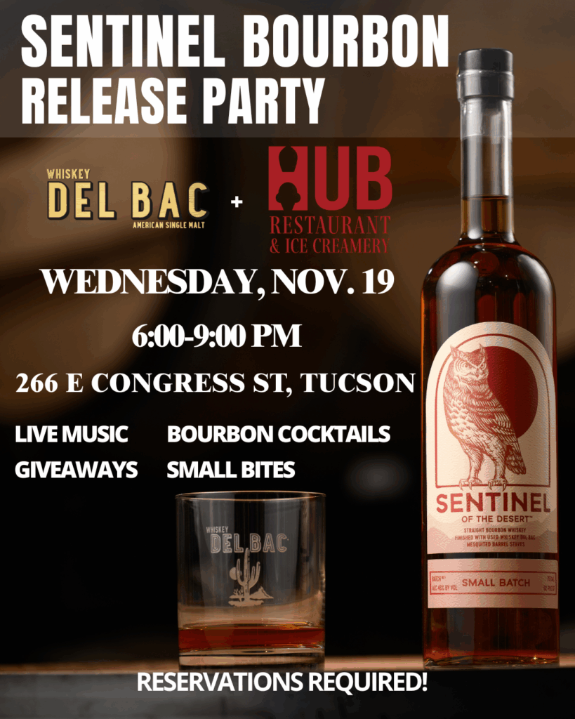 Join the Hub Restaurant & Creamery on Wednesday, November 19th from 6:00-9:00 pm for a libation-filled evening to celebrate their newest release, Sentinel of the Desert Bourbon!