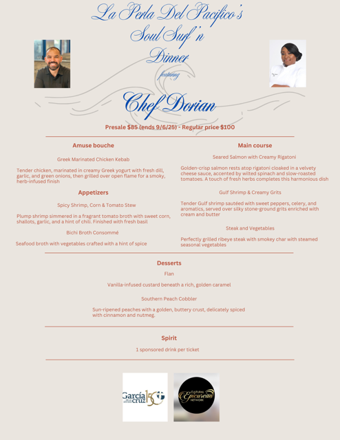 Chef Dorian Hunter, winner of MasterChef Season 10, will bring her celebrated Southern culinary style to La Perla Del Pacífico Restaurant for an exclusive evening of flavor and creativity. For one night only, Chef Dorian will collaborate with the La Perla team to present a special multi-course menu that fuses her signature Southern flair with the bold, authentic flavors of the Pacific coast.