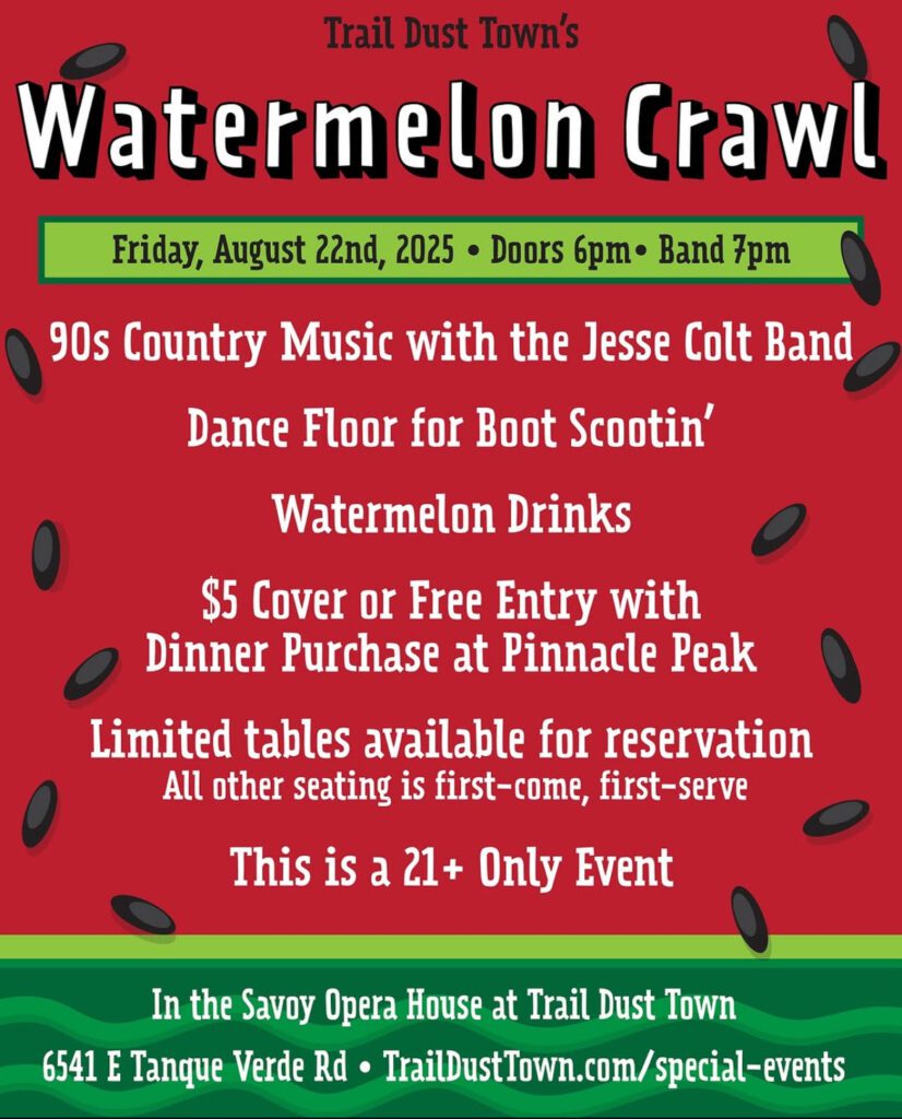 The doors will open at 6pm. Jesse Colt Band will start their first set at 7pm and finish their last set at 10pm. There will be a bar inside the Savoy Opera House serving up watermelon-themed drinks as well as a full bar. There is no food available in the Savoy Opera House, so we recommend grabbing dinner at Pinnacle Peak before!