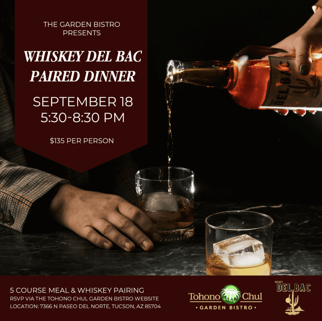 Experience an unforgettable evening of flavor and craftsmanship at a special four-course dinner paired with award-winning American single malt whiskeys from Whiskey Del Bac. This is a one-of-a-kind culinary journey in the beautiful setting of Tohono Chul Garden Bistro.
