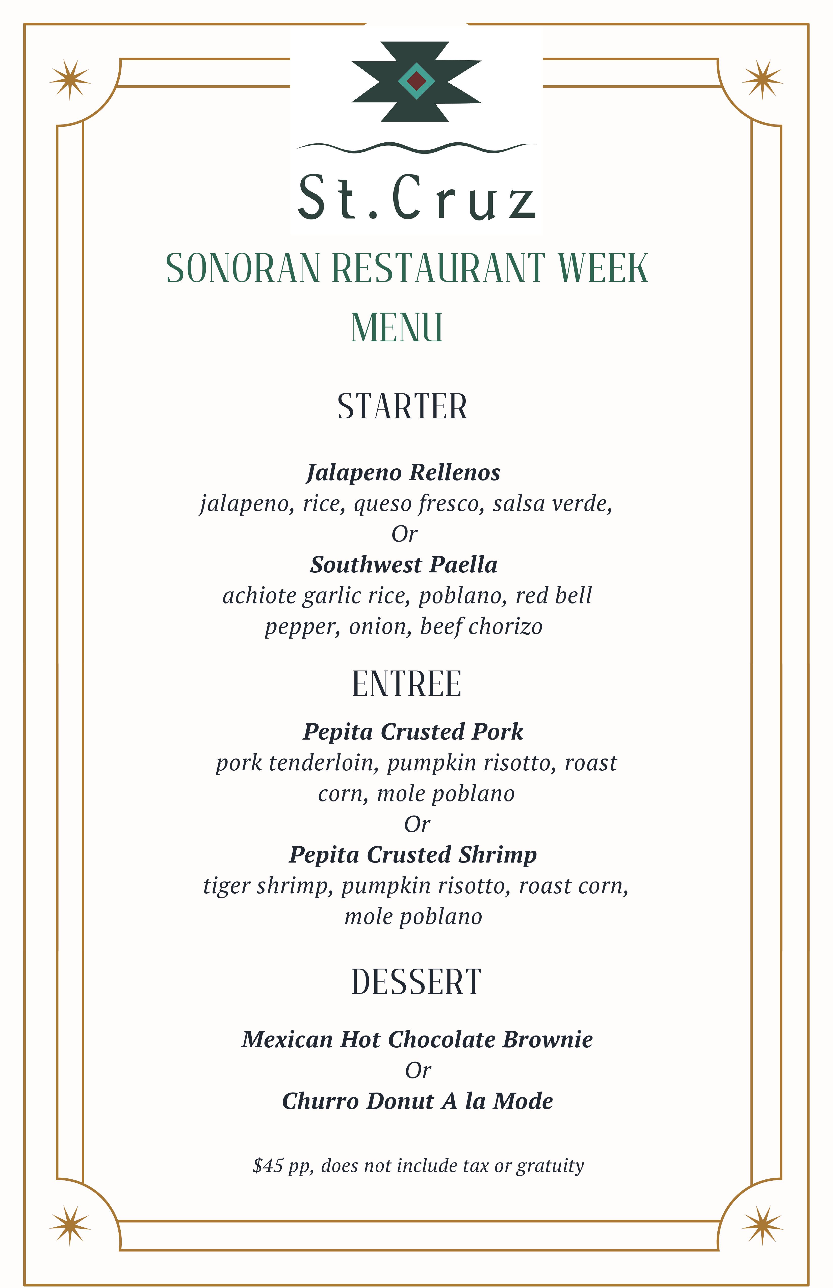 Elegant entrée features offered nightly throughout Sonoran Restaurant Week. Please inquire with your server for current offerings.